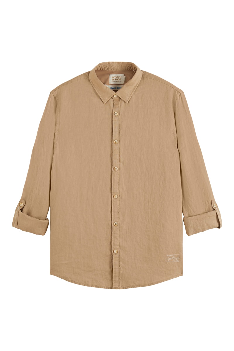 Chemise en lin à manches longues retroussables par patte boutonnée.