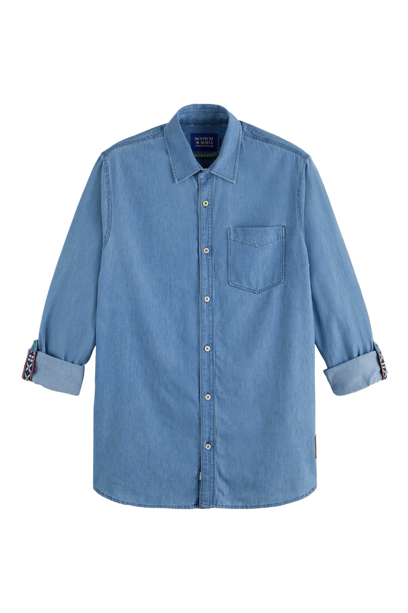 Chemise en jean à manches longues retroussables par patte boutonnée.