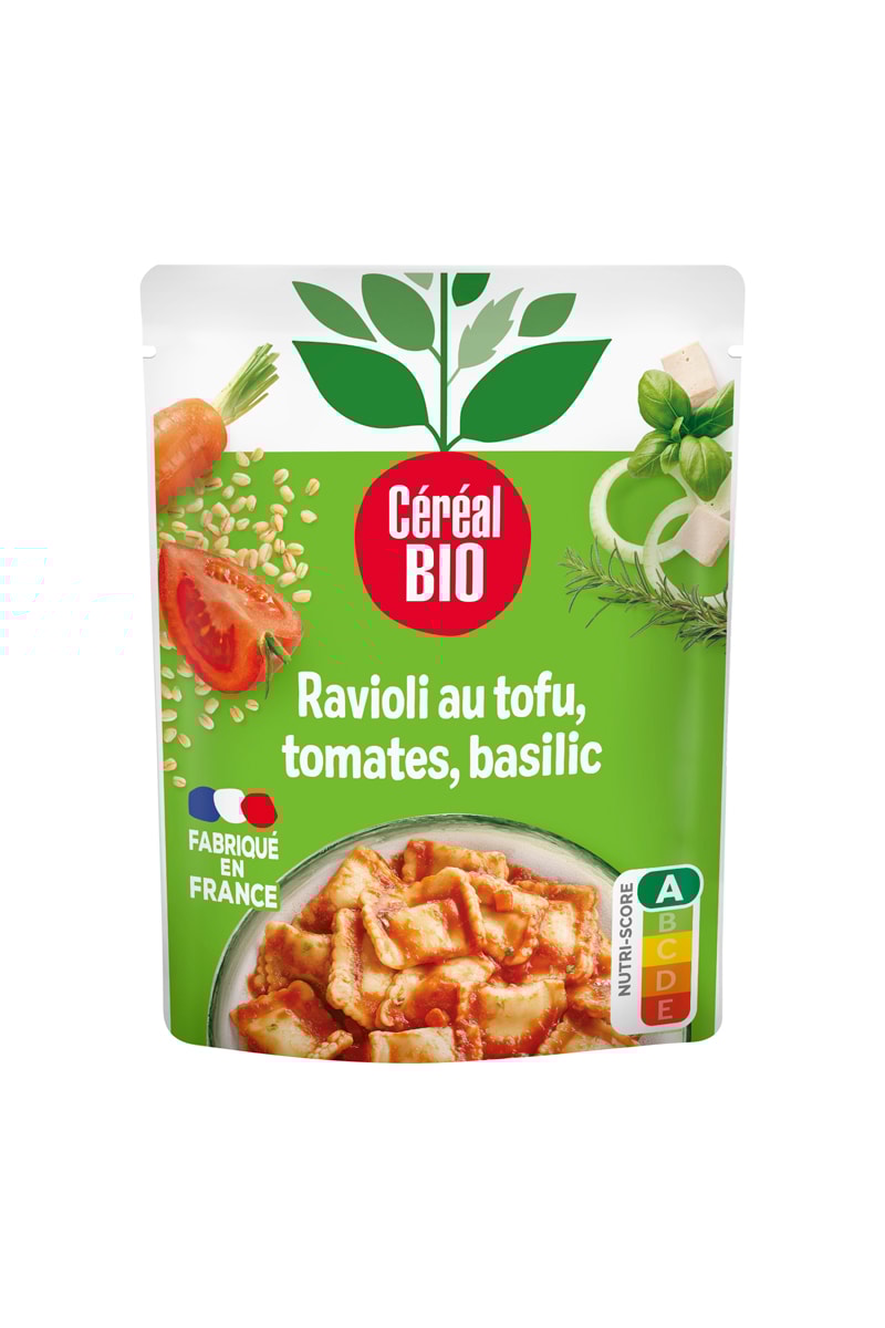 Ingrédients : Eau, pâte alimentaire* (semoule de BLE dur*13,8%, eau), concentré de tomate* 16,3%, tofu* 6,7% (eau, SOJA*, agents coagulants : sulfate de calcium, chlorure de calcium, nigari), oignons*, huile de tournesol*, carottes*, champignons*, chapelure* (farine de BLE* 1,3%, levure, sel), semoule de BLE dur*1%, basilic* 0,9%, sel de mer, épices*, sucre de canne*, oignons* frits (oignons*, huile d'olive* extra vierge, jus de citron*), herbes de Provence*. Ravioli 25% dans la recette. Fabriqué dans un atelier qui utilise CELERI, FRUITS A COQUE, MOUTARDE, OEUF, LAIT, SESAME