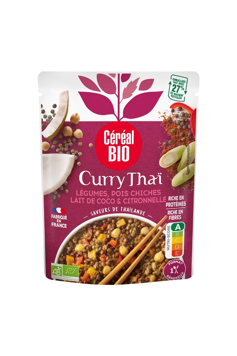 Spécialité végétale à base de légumes, lentilles, pois chiches et soja, cuisinée façon curry thai, issue de l'agriculture biologique.