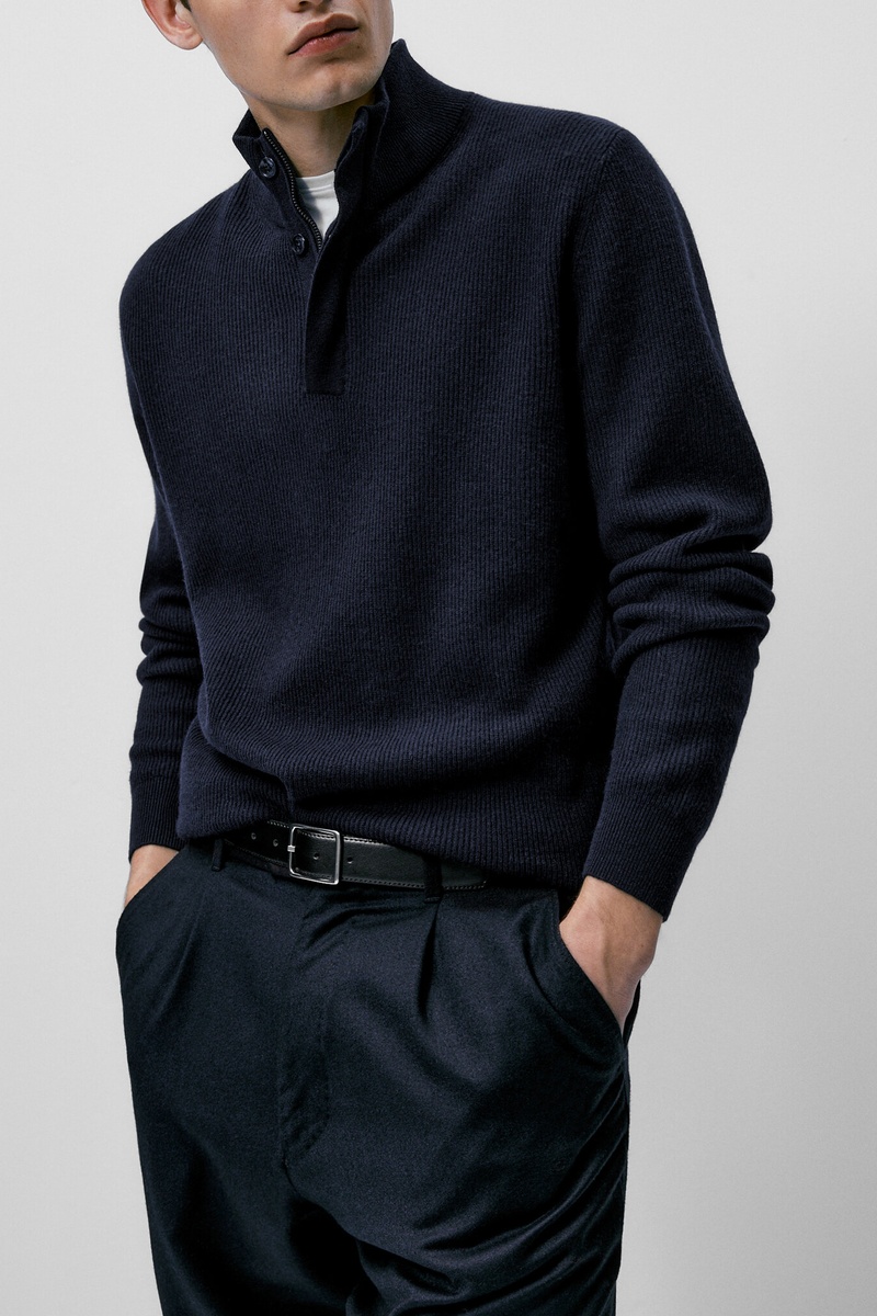 Pull col cheminée fermeture Éclair et boutons en laine - Bleu marine
