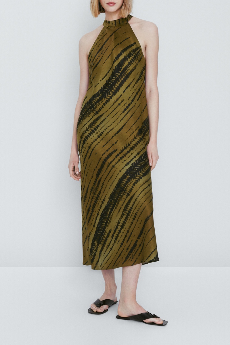 Robe longue imprimée encolure américaine - Vert olive et noir