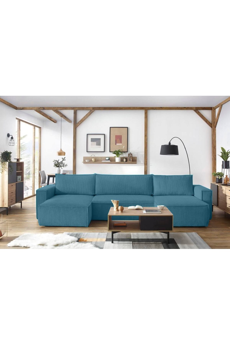 Canapé d'angle panoramique convertible Nihad - Bleu canard - Couchage 328 x 139 cm