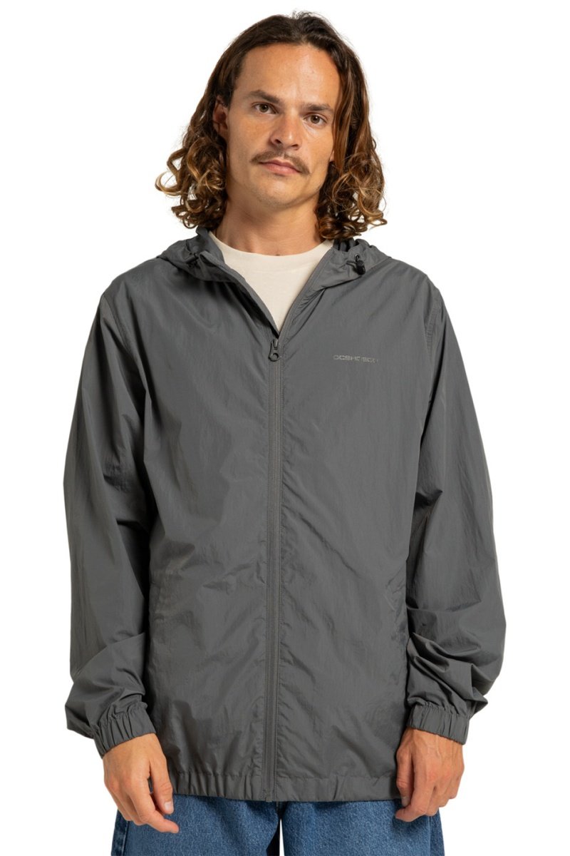 Coupe-vent à capuche avec liens de serrage et barillets.