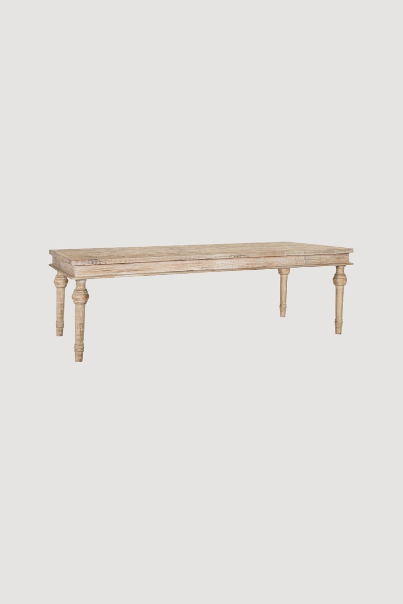 Son plateau est souligné par des figures géométriques sculptées avec précision, qui contrastent subtilement avec la finition patinée blanche, lui donnant un aspect vieilli unique.