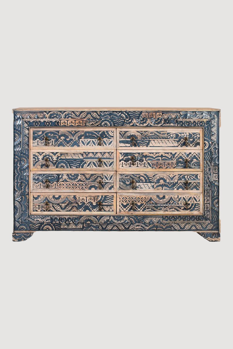 8 tiroirs avec décorations sculptées artisanales.