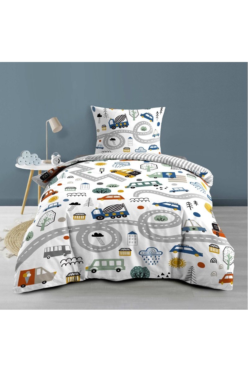 Parure de couette en coton Pti Bolide - Blanc et bleu
