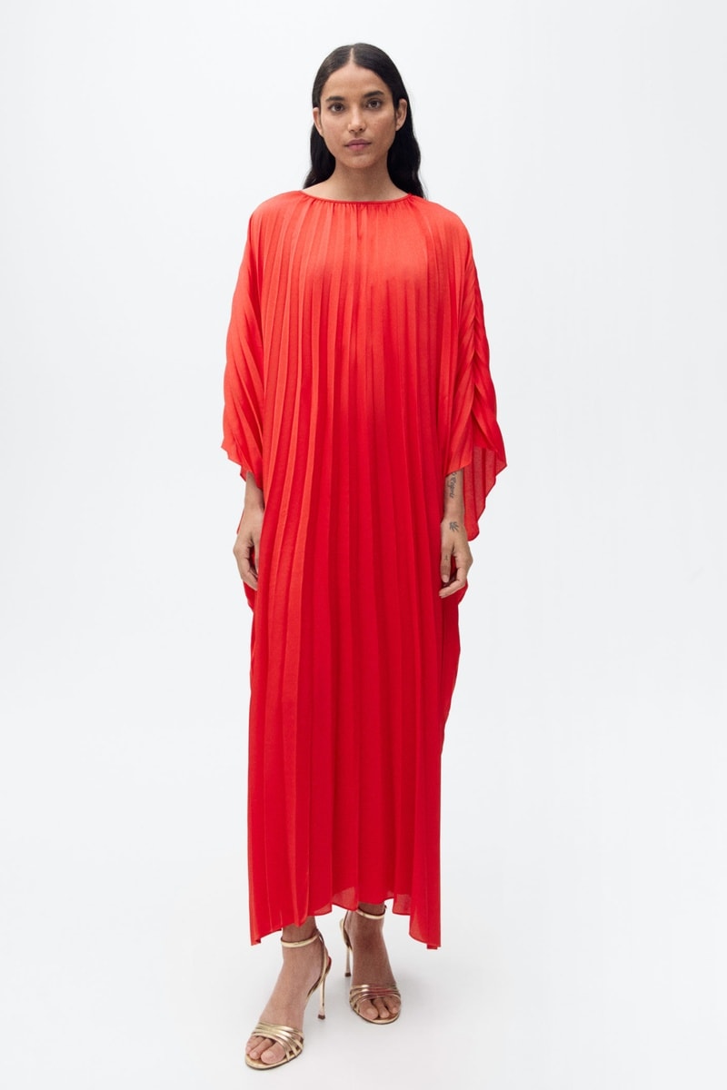 Robe plissée à manches trois-quarts - Rouge