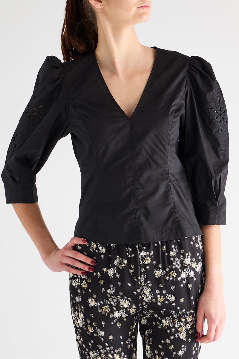 Blouse à manches trois-quarts bouffantes avec broderies ajourées.