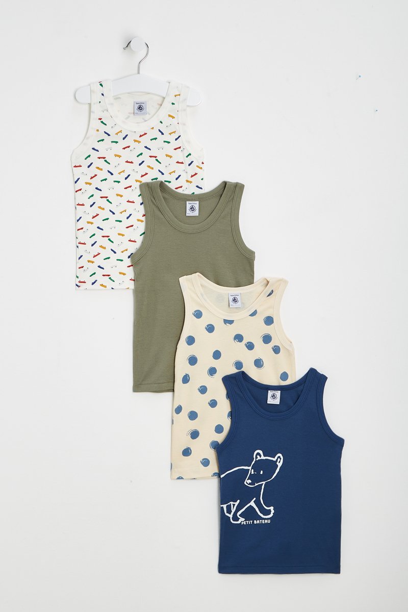 4 débardeurs dont 2 à motifs fantaisie et 1 à motifs fantaisie et logo devant.