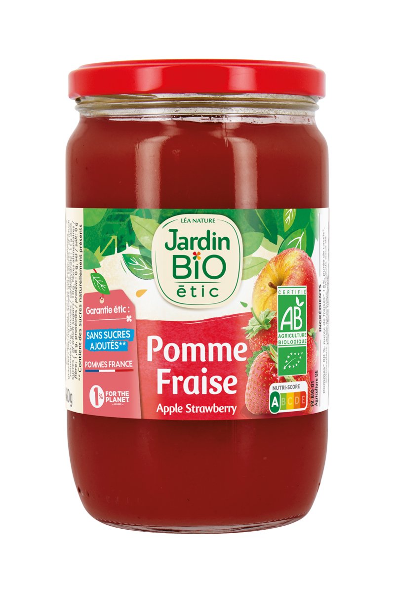 Ingrédients : Pommes* 80 %, purée de fraises* 18%, purée de cassis*, antioxydant : acide ascorbique.