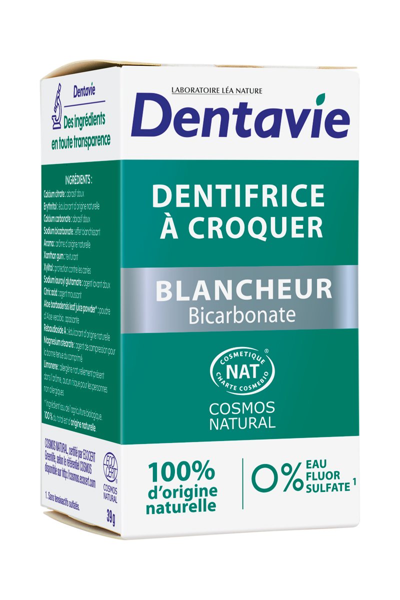 Dentifrice à croquer blancheur au bicarbonate de sodium.