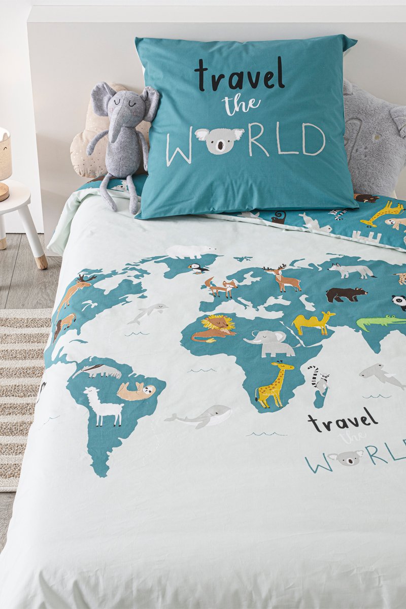 Parure de couette en coton 115 g/m² Carte du monde - Blanc et bleu canard