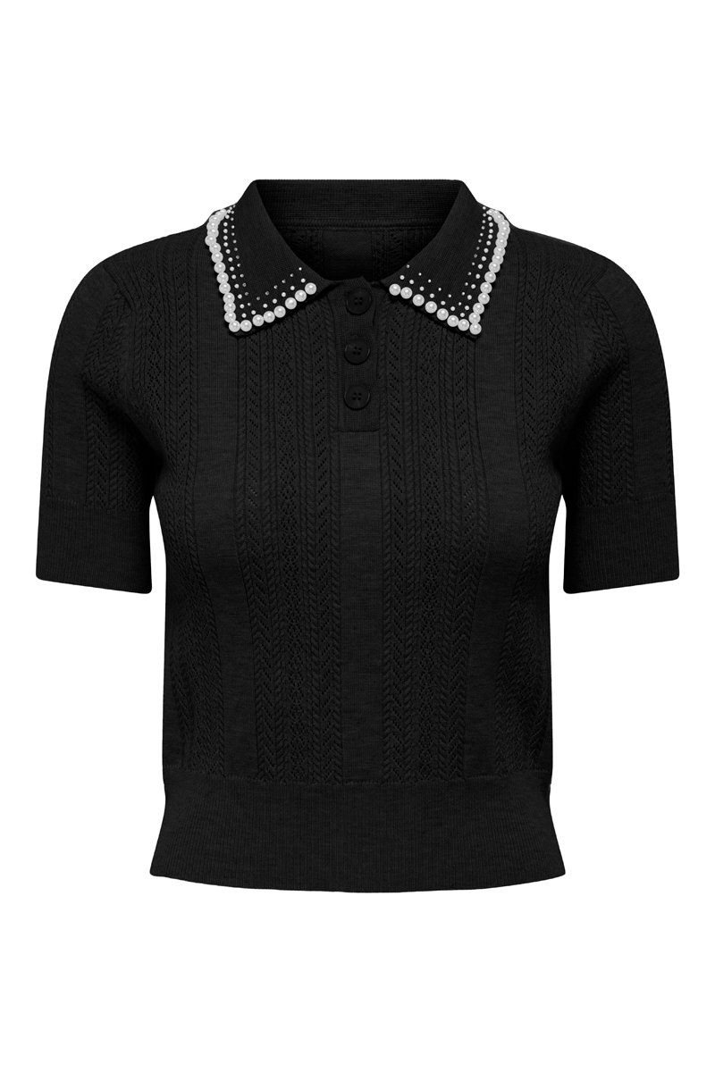 Col avec patte boutonnée et perles décoratives.