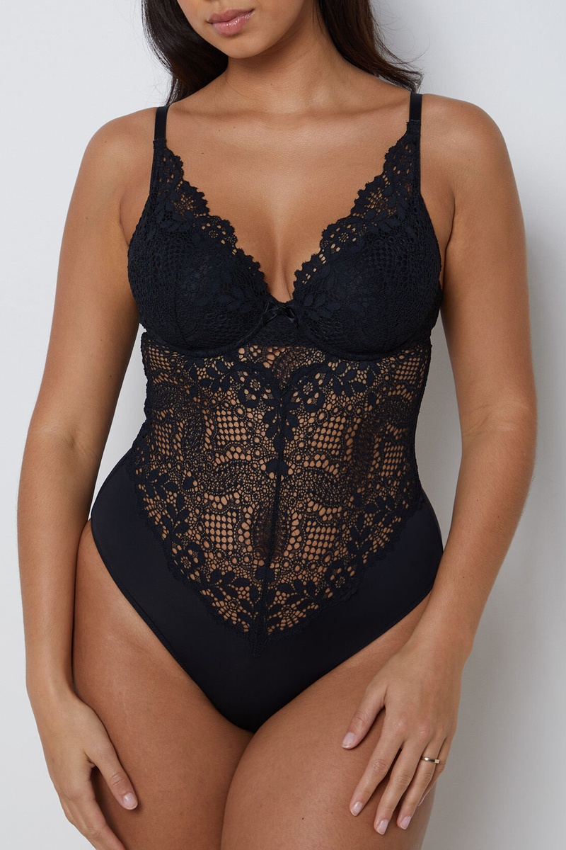 Fermeture pressionnée à l’entrejambe et par agrafes au dos.