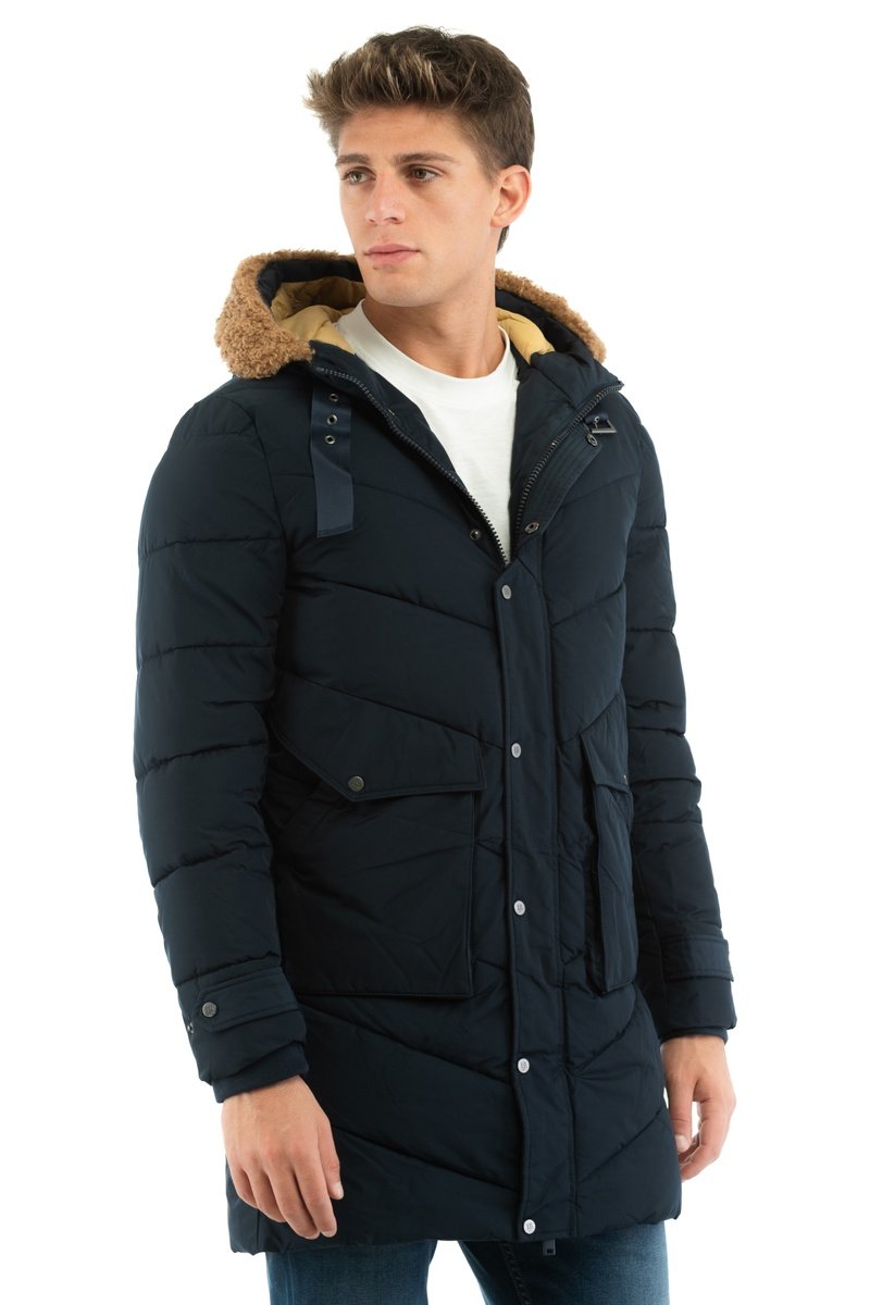Doudoune à capuche avec fourrure synthétique et bride à boucle.