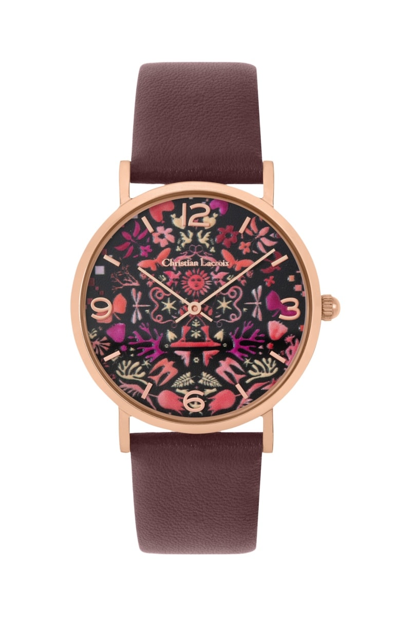 Montre à quartz en cuir Rêve de papier - Bordeaux et doré rose