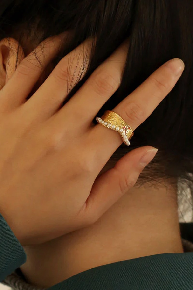 Bague réglable en plaqué or jaunesertie de perles d'imitation.