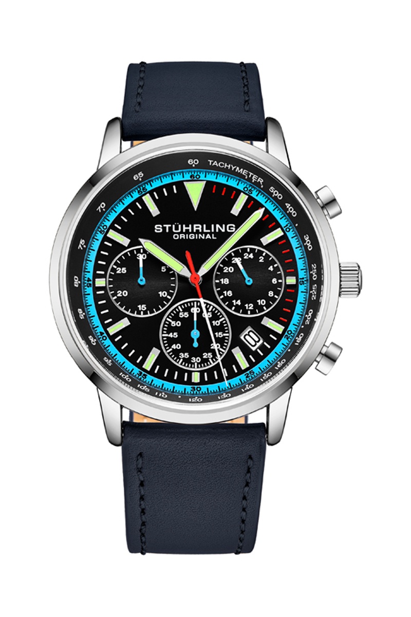 Montre à quartz en cuir Monaco - Tachymètre et chronographe - Bleu foncé et argenté