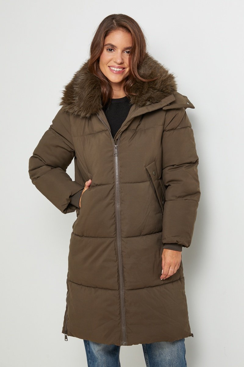 Doudoune longue droite à capuche avec fourrure synthétique.