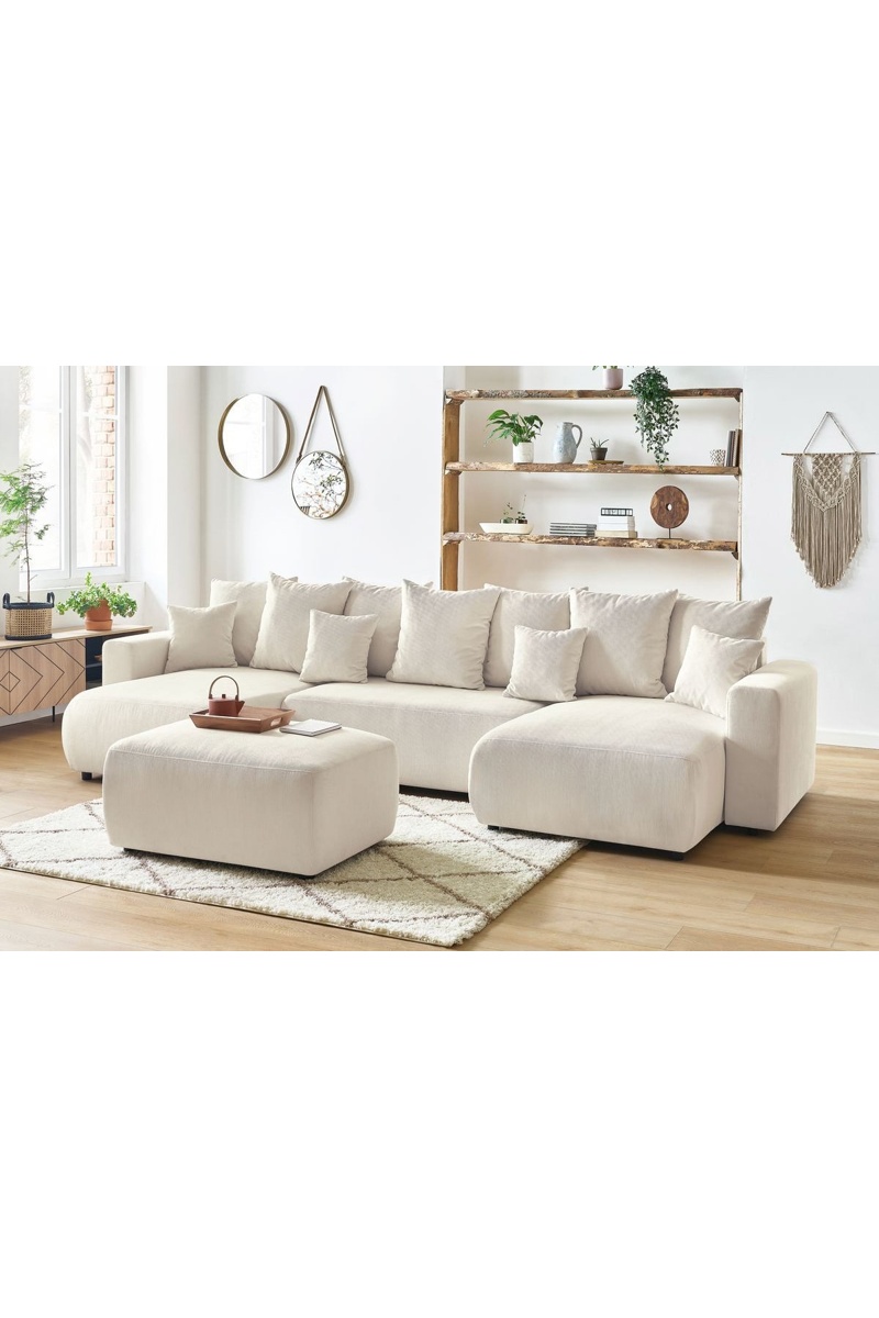 Canapé panoramique convertible et pouf Envy - Crème - Couchage 330 x 139 cm
