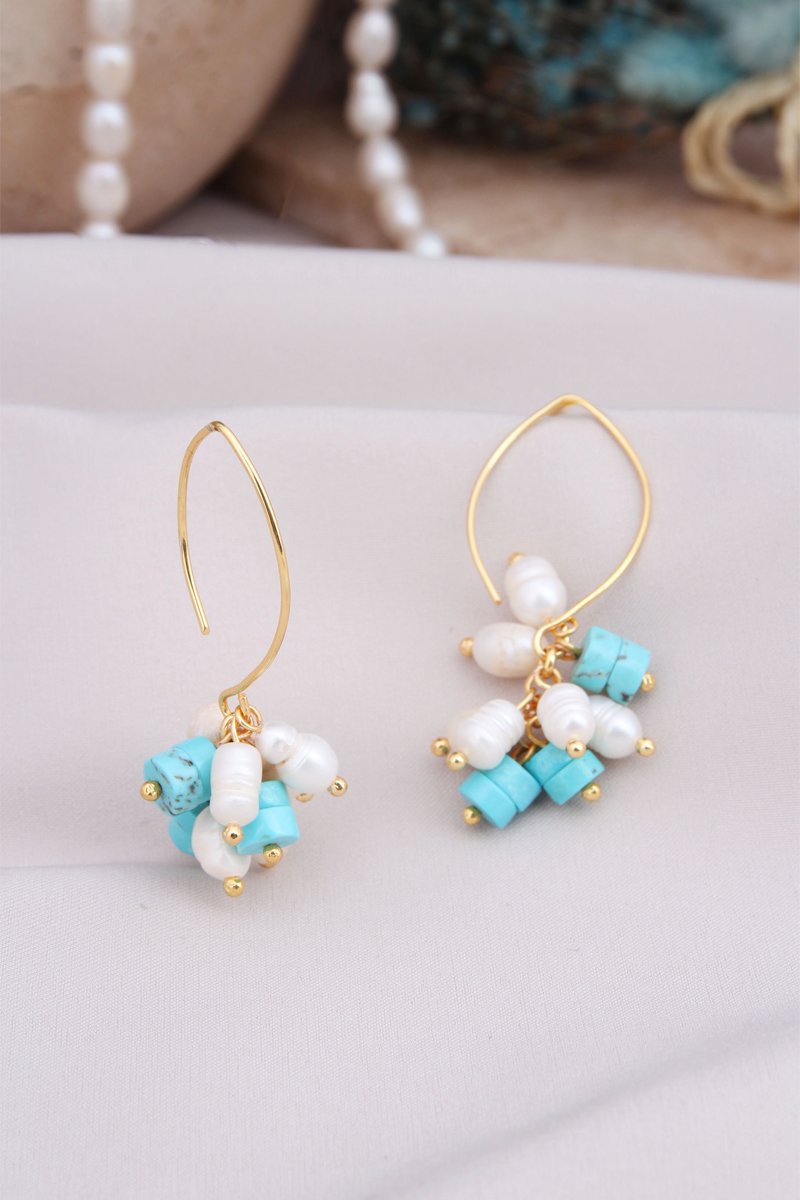 Boucles d’oreilles pendantes serties de 6 turquoises et de perles d’imitation.