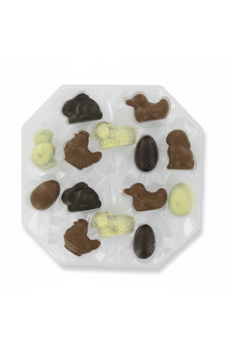Assortiment animaux de Pâques en chocolat praliné. 15 portions Goût praliné noisettes.