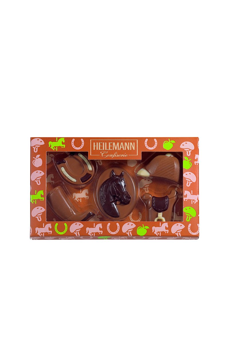 Coffret Cheval en chocolat au lait décoré.
