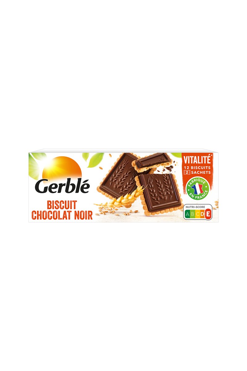 Paquet de biscuits avec tablette de chocolat noir.