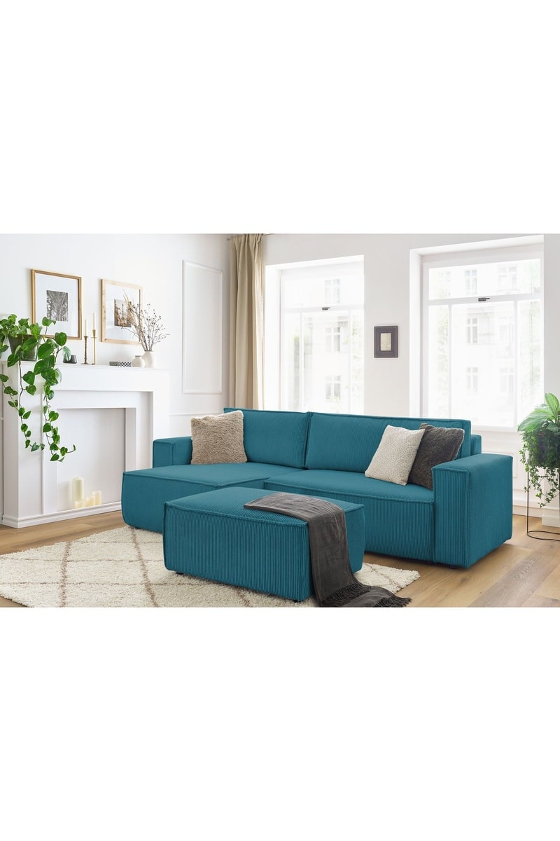 Canapé d'angle réversible et pouf Nihad - Bleu canard - Velours côtelé