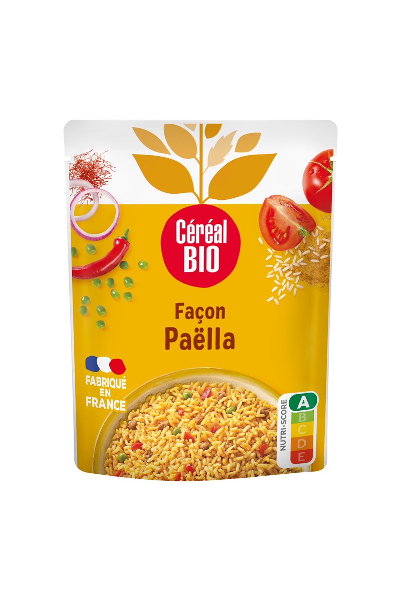 Ingrédients : eau, riz blanc* 30,4%, poivrons rouges* 8%, protéines de soja* texturées 4,8%, petits pois* 3,2%, huile de tournesol*, oignons* 2,4%, concentré de tomate* 1,4%, sel de mer, ail* en poudre, oignons* en poudre, curcuma*, piment fort* en poudre, safran*. * Ingrédients issus de l’agriculture biologique. Fabriqué dans un atelier qui utilise : céleri, fruits à coque, moutarde, œuf, lait, sésame, gluten. Source de protéines et de fibres.