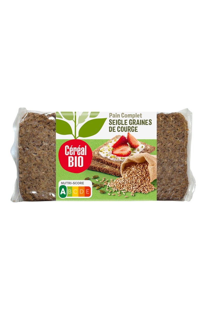 Ingrédients : farine complète de seigle* 55%, eau, graines de courges* 5%, sel de mer, levure de boulanger.