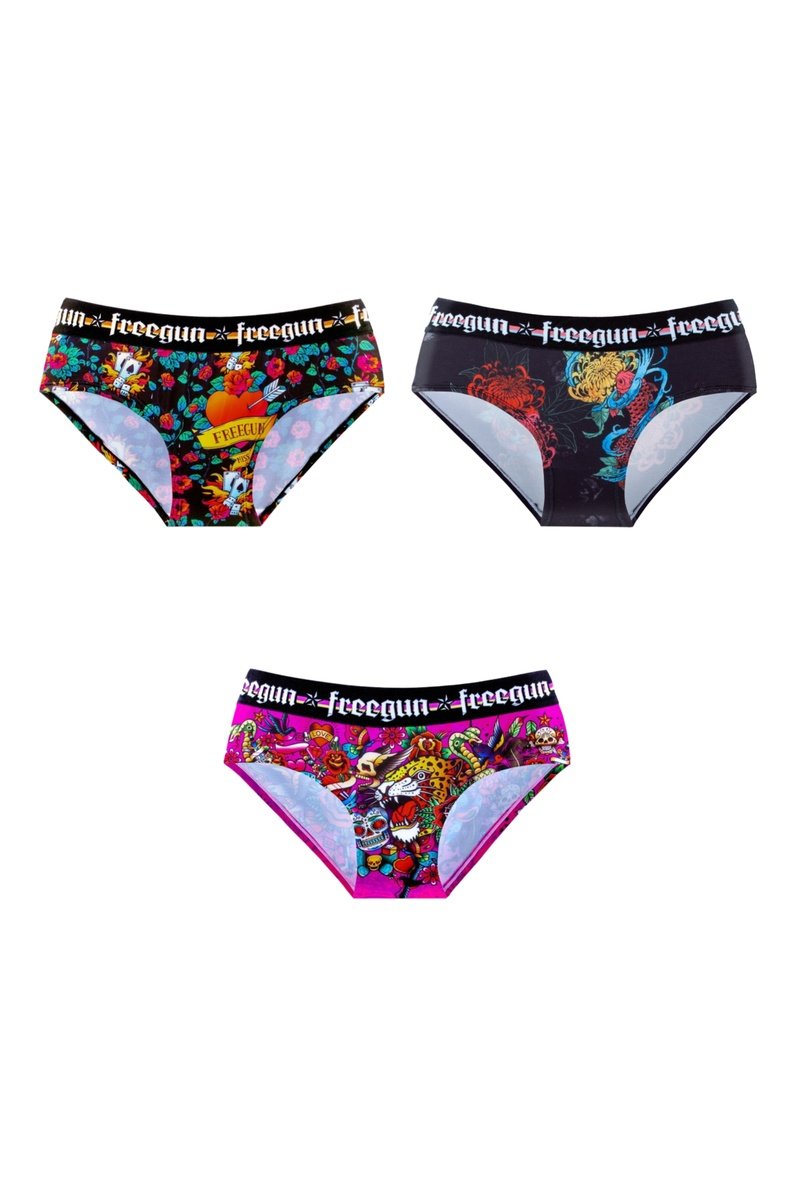 Depuis sa création en 2007, Freegun a rapidement envahi les rues et les circuits, habillant les adeptes de streetwear et de sports extrêmes. La marque jeune et tendance propose des collections de sous-vêtements, des t-shirts et des accessoires pour adulte et enfant au design flashy et aux imprimés fantaisie.