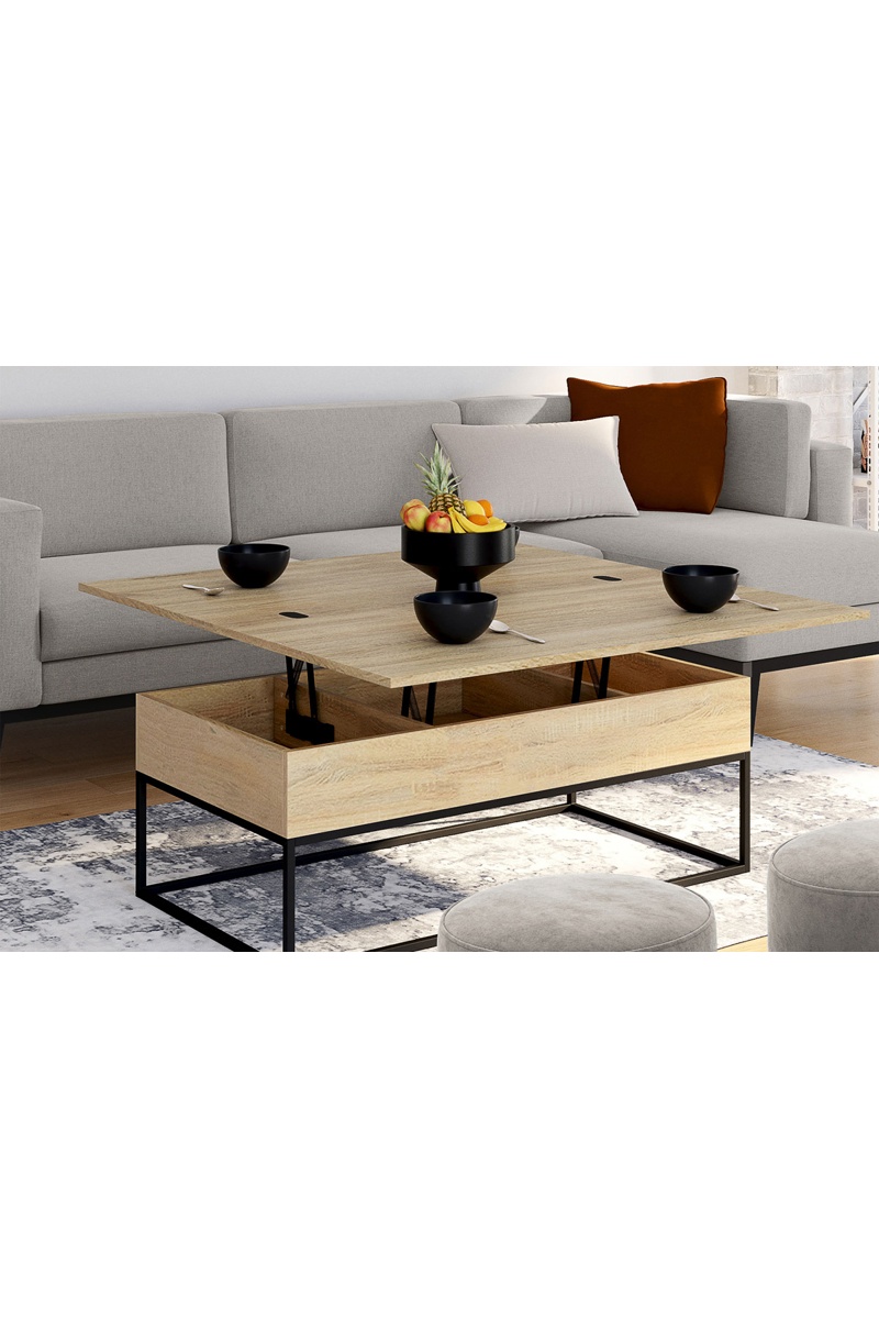 Table basse extensible avec plateau relevable.