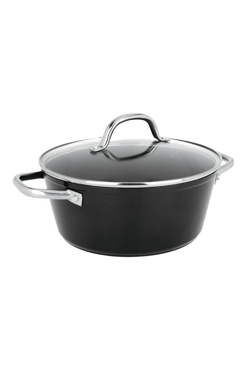 Faitout en aluminium forgé avec couvercle et soupape anti-buée.