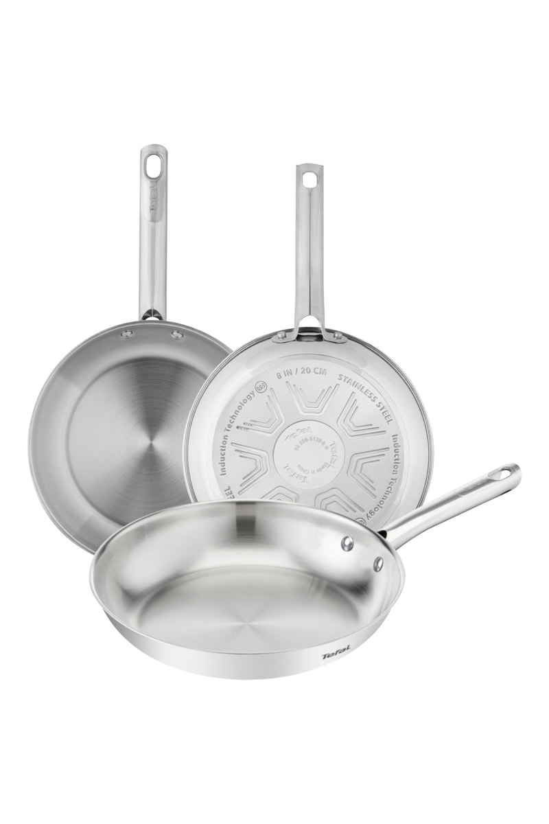 3 poêles en acier inoxydable.
