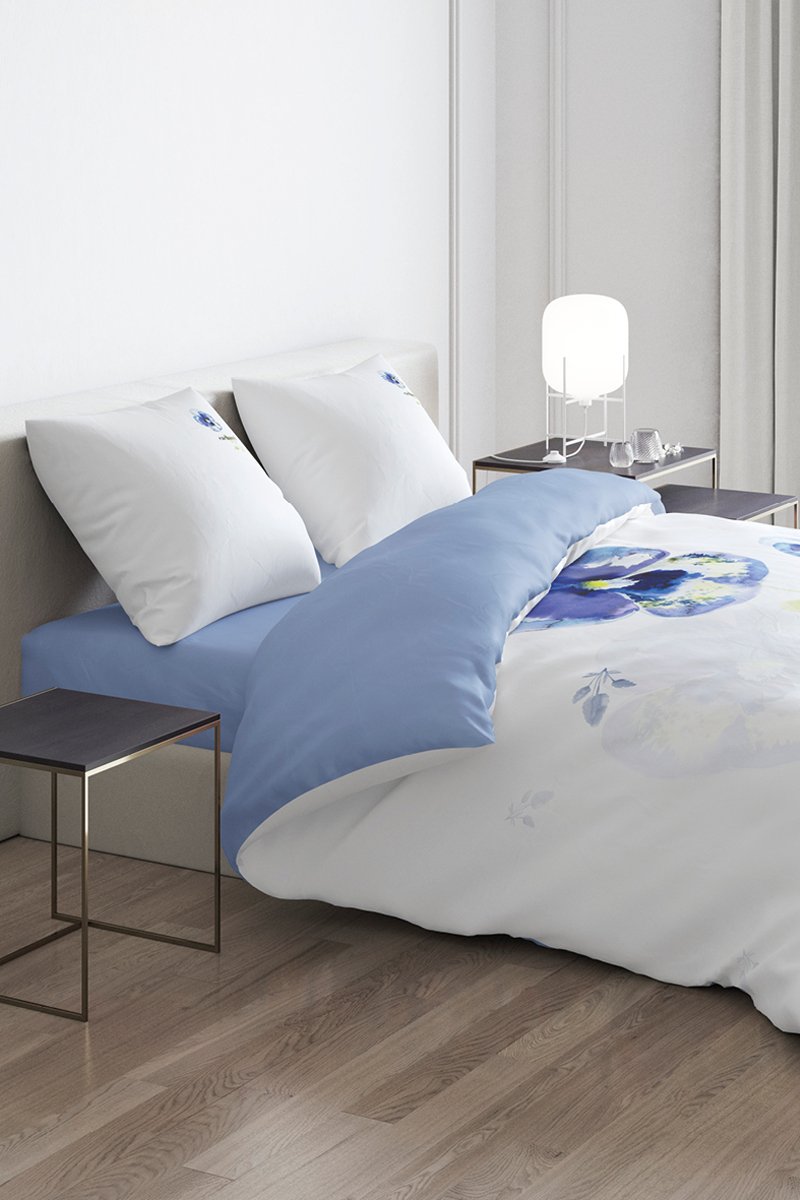 Parure de couette en satin de coton 200 fils/cm² Pansy - Bleu et blanc