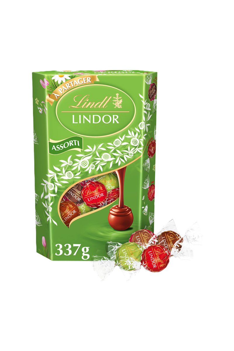 Pour les fêtes de Pâques, craquez pour notre nouveau cornet Lindor Assorti Edition de Pâques 337 g, un assortiment exclusif de quatre recettes Lindor : lait, noisette, double chocolat et pistache.