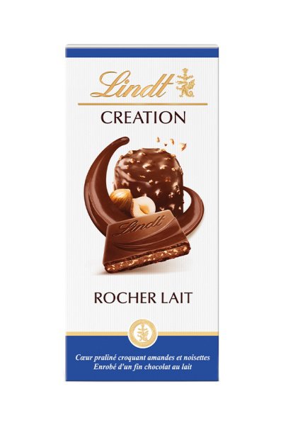 Succombez à Lindt Création Le Rocher Lait : un praliné amandes et noisettes fondant allié aux croustillants éclats de noisettes caramélisés, au cœur du fin chocolat au lait Lindt.