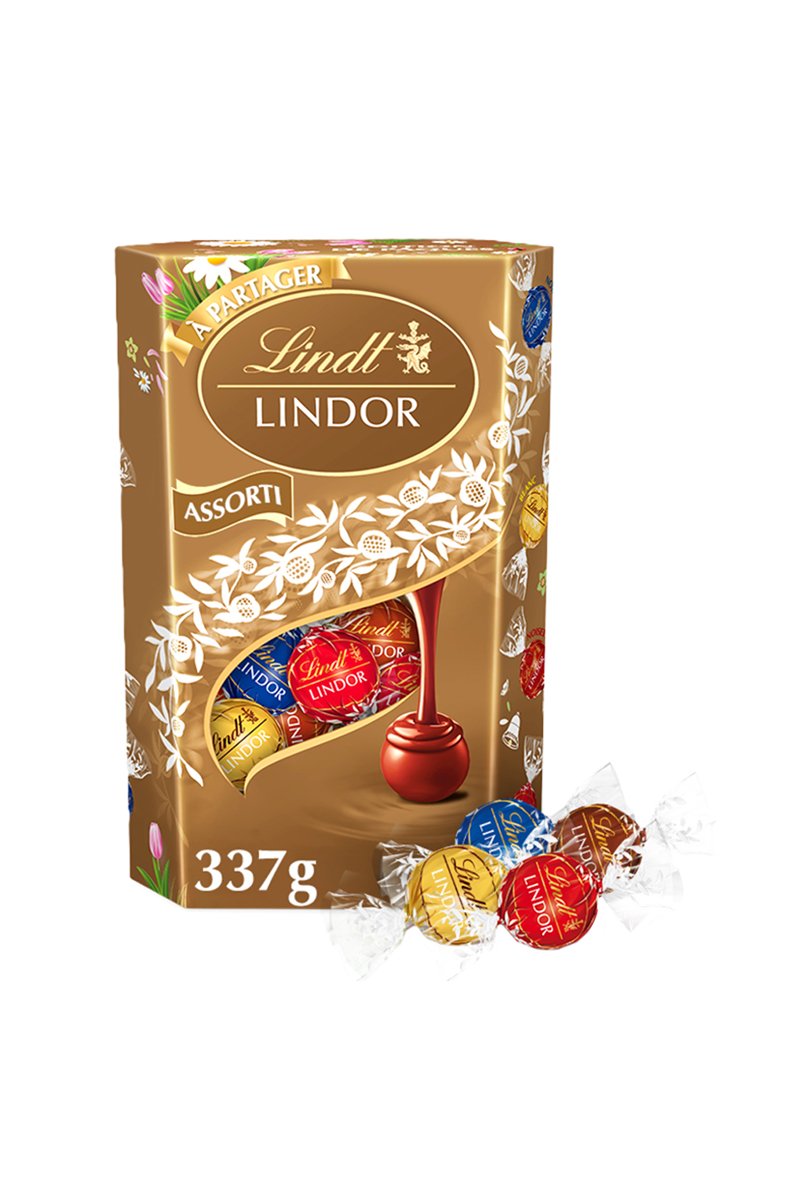 Pour les fêtes de Pâques, craquez pour notre nouveau cornet Lindor Assorti 337 g, un assortiment de quatre recettes Lindor emblématiques : lait, noir, blanc et noisette.
