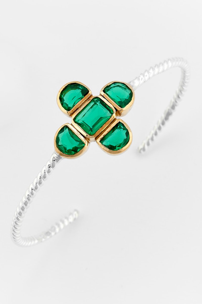 Jonc ouvert en argent et laiton serti de verre teinté vert.