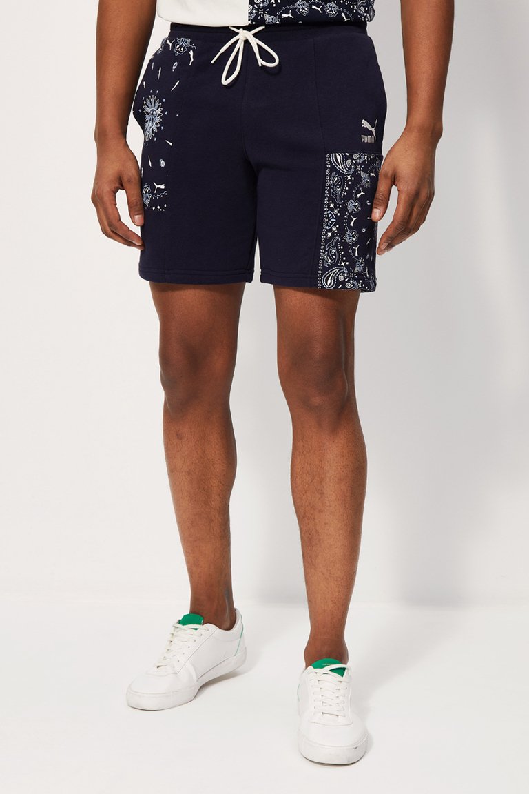 Empiècements contrastants à motifs cachemire. Logo sur la jambe gauche.