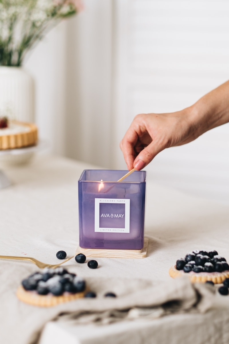 Elle vous met l'eau à la bouche lorsque vous l'apercevez sur le comptoir d'un café : la tarte aux myrtilles fraîchement cuite. Ce délicieux dessert sucré et crémeux dégage un parfum irrésistible de myrtilles juteuses et de délicates notes de vanille. La douceur chaleureuse du musc vient parfaire l'arôme intense de cette maxi bougie parfumée de 400 g. Bienvenue au paradis des gourmands !