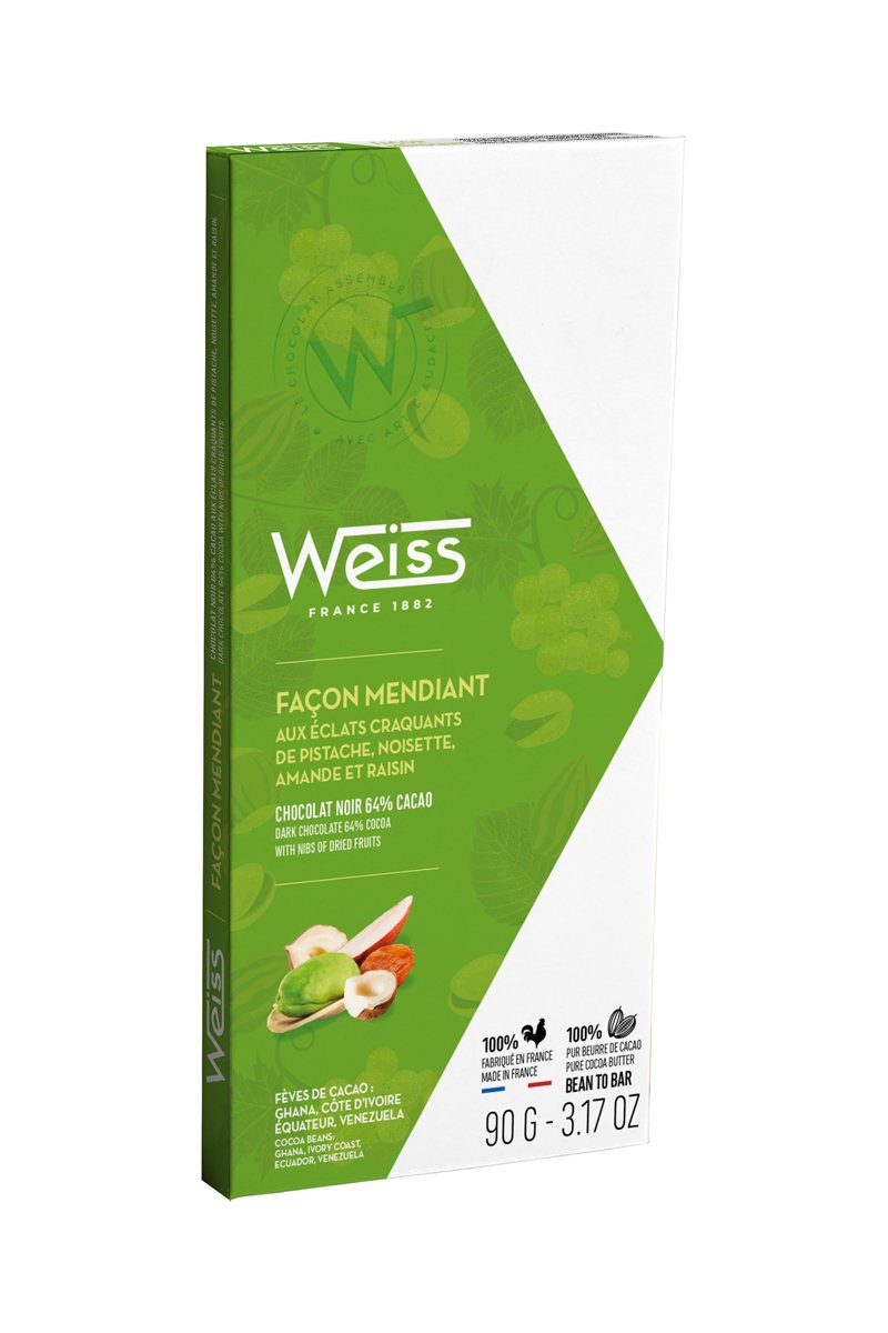 Tablette de chocolat noir Façon mendiant 64% cacao.
