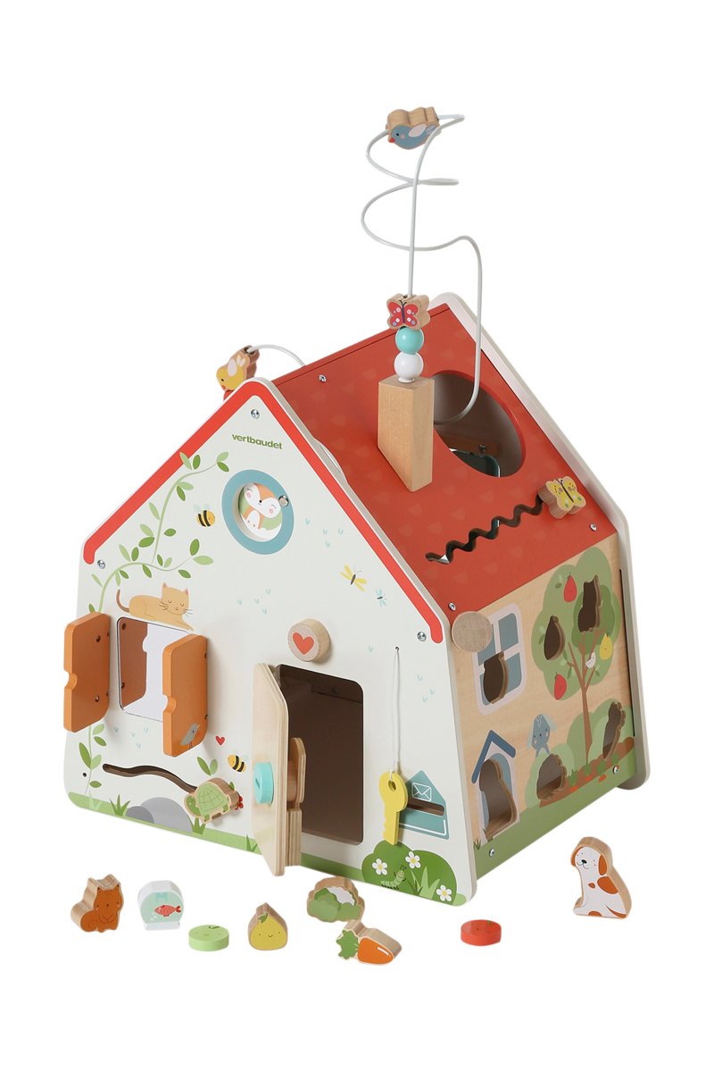 Grande maison d'activités en bois comprenant : - Toit : grand boulier (avec 4 billes et 3 formes : 2 hirondelles et 1 papillon) qui passe par l'intérieur de la maison grâce à une petite ouverture ronde.
