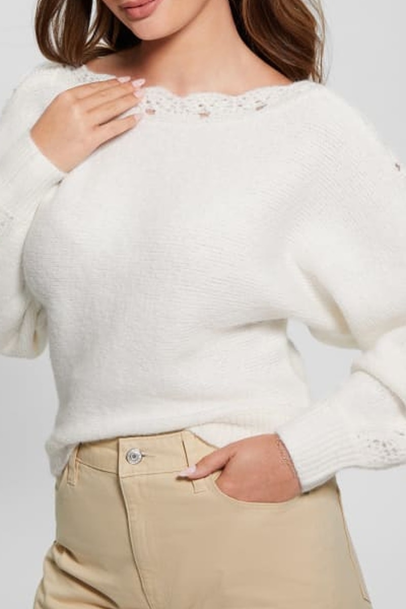 Maille ajourée à l'encolure et sur les manches.