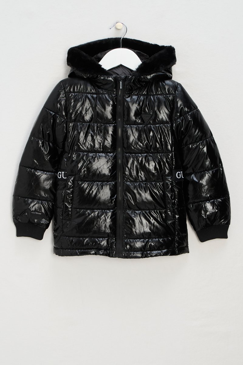 Doudoune longue à capuche avec fourrure synthétique.