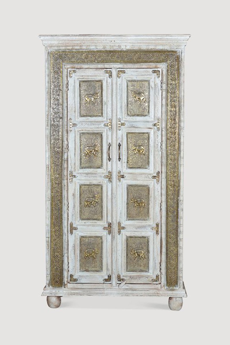 Armoire 2 portes - Ecru et doré - Structure en bois de manguier - 95 x 45 x 183 cm