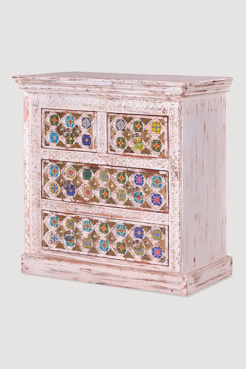Commode 4 tiroirs - Blanc vieilli et doré - Structure en bois de manguier et détails en bronze et céramique - 90 x 40 x 90 cm