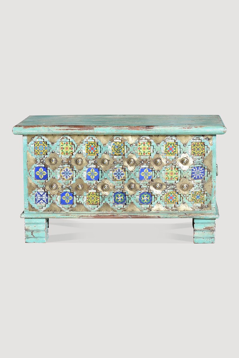 Coffre - Vert d'eau et bleu - Structure en bois de manguier et détails en bronze et céramique - 80 x 45 x 40 cm